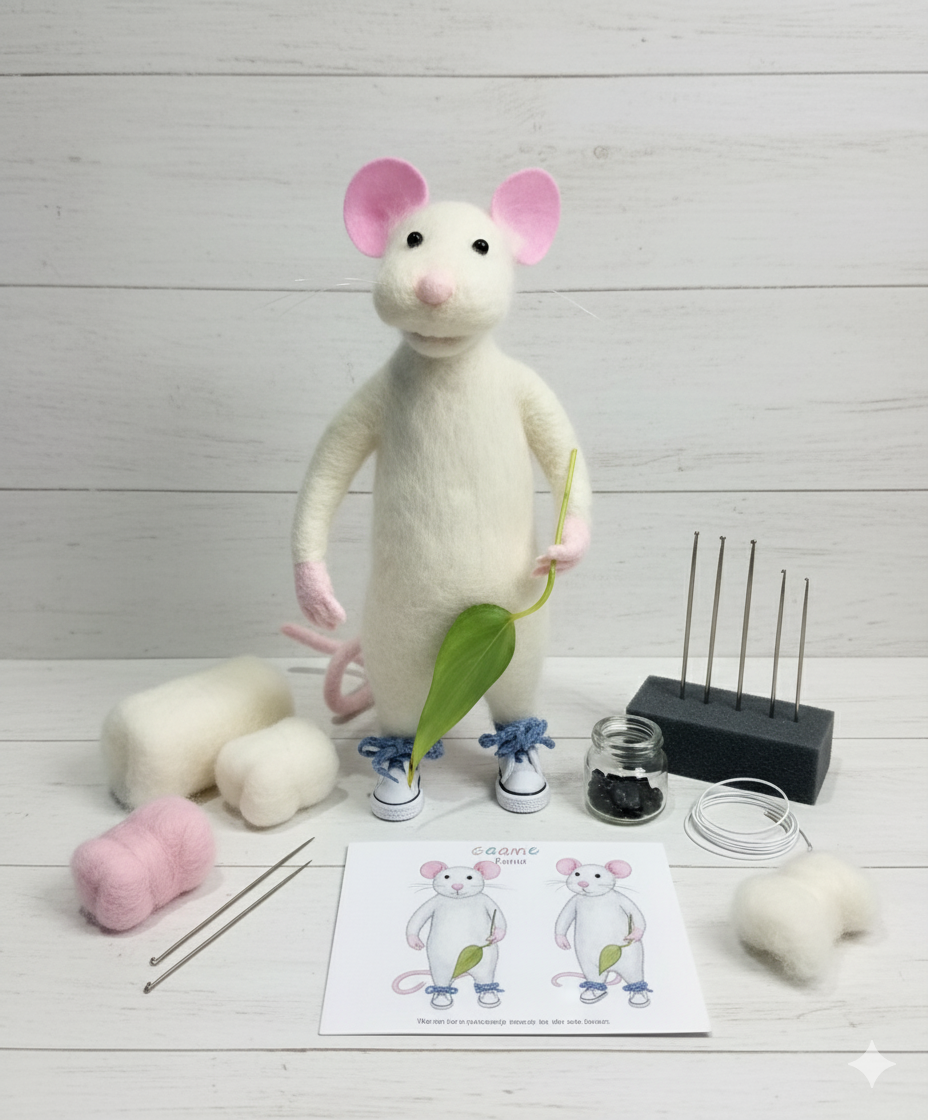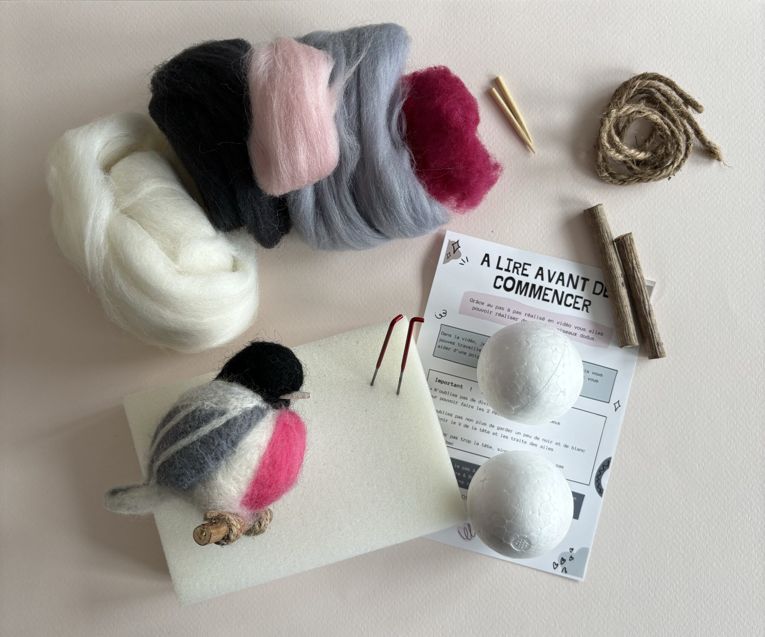 3 couleurs de laine cardée ( gris, noir, blanc)+ un petit bonus pour les ailes