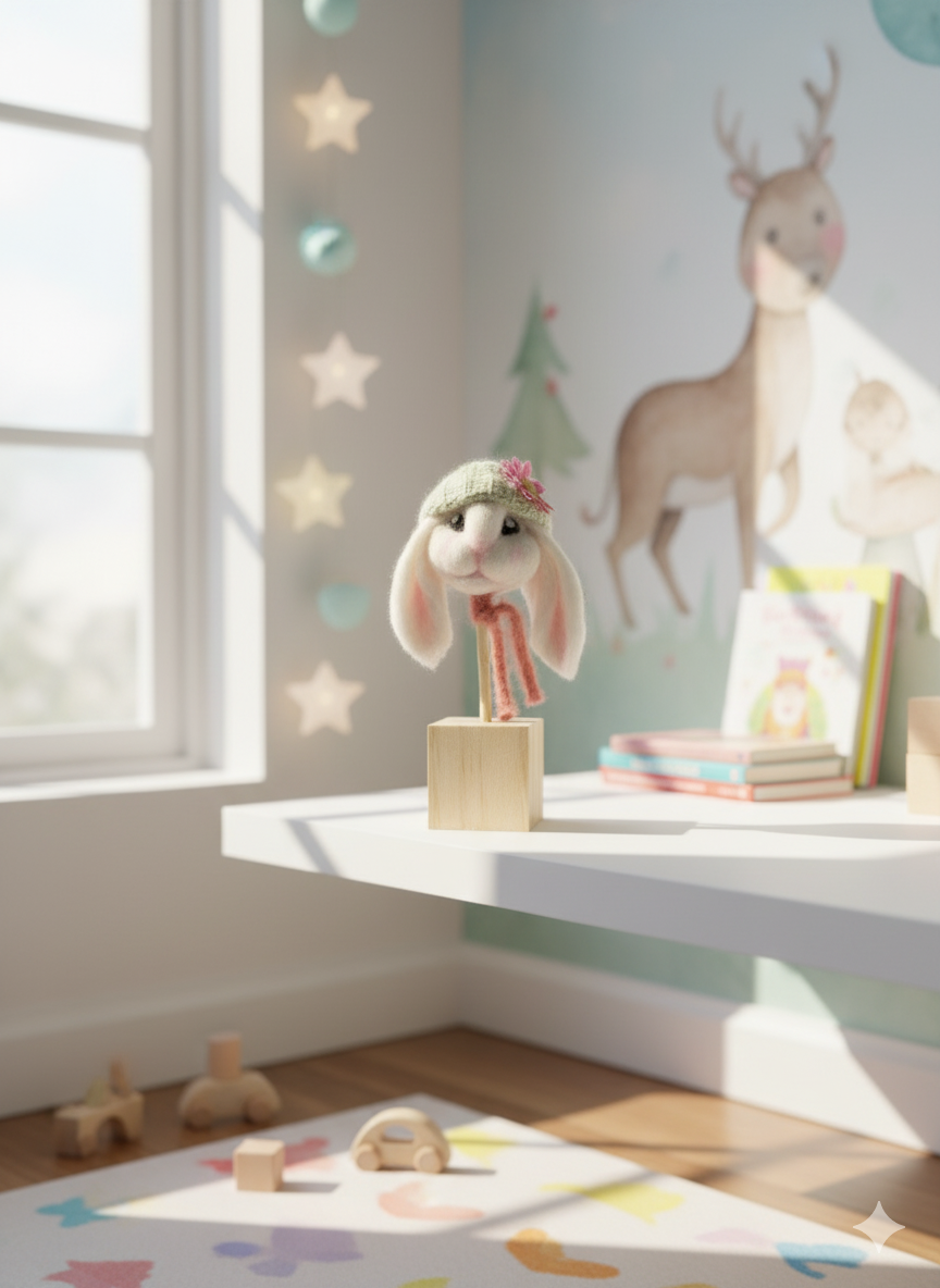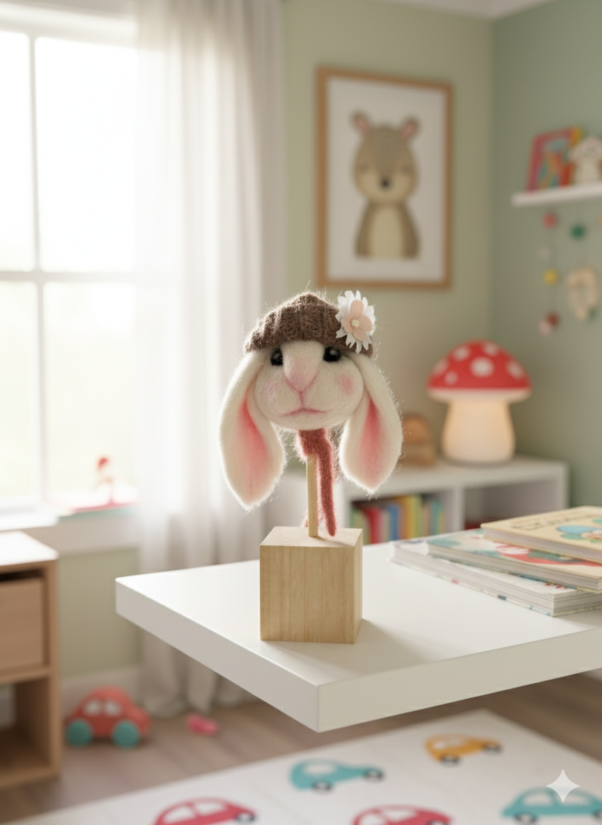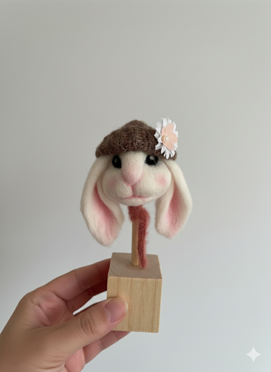 🌼 Mini tête de Miss Flopsy – Sculpture en laine cardée