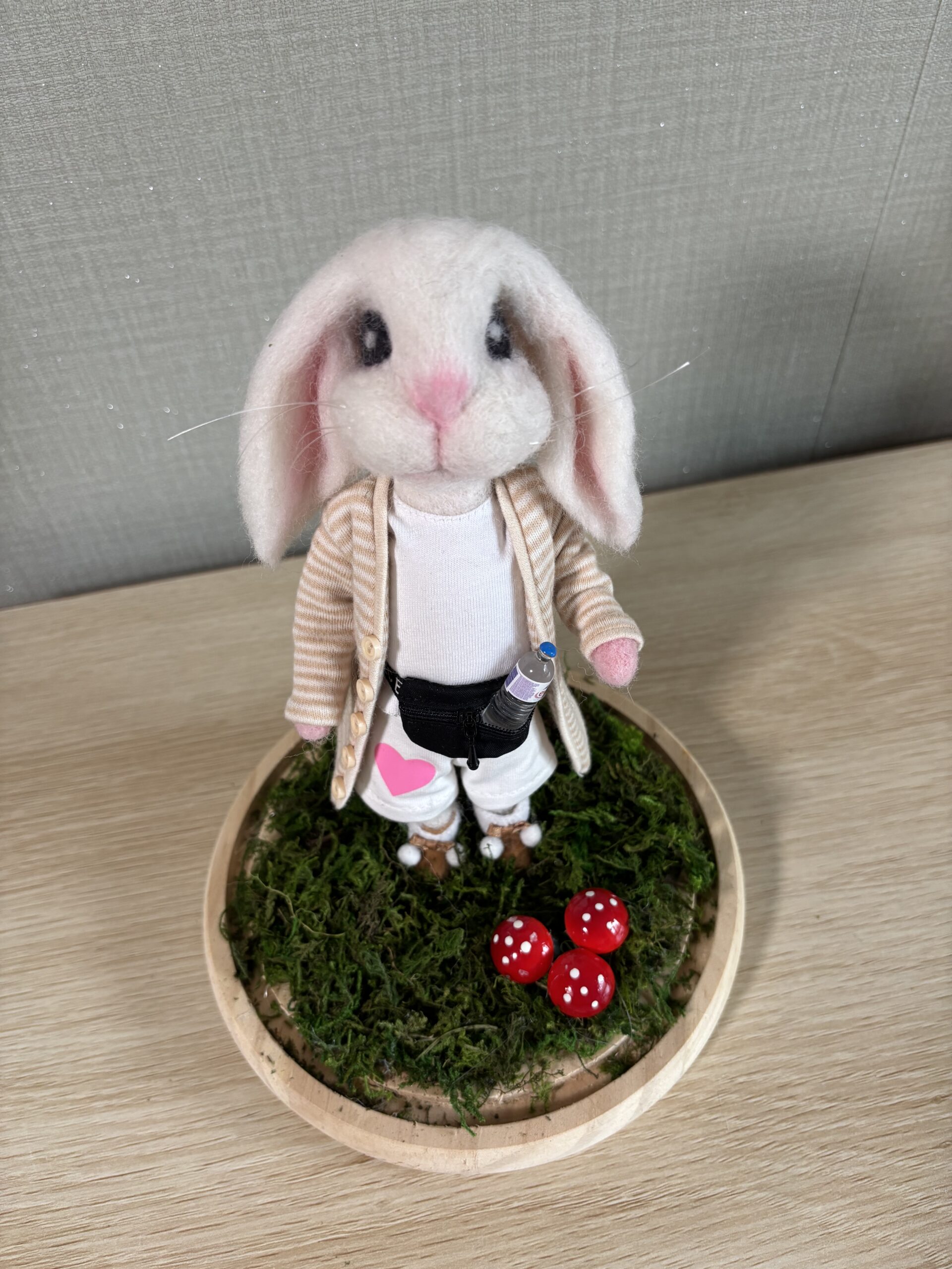 Entièrement réalisée à la main dans mon atelier à Wallers, cette sculpture est modelée en laine cardée grâce à la technique du feutrage à l’aiguille. Chaque détail, du pelage soyeux à la tenue cousue sur mesure, témoigne d’un savoir-faire artisanal unique.