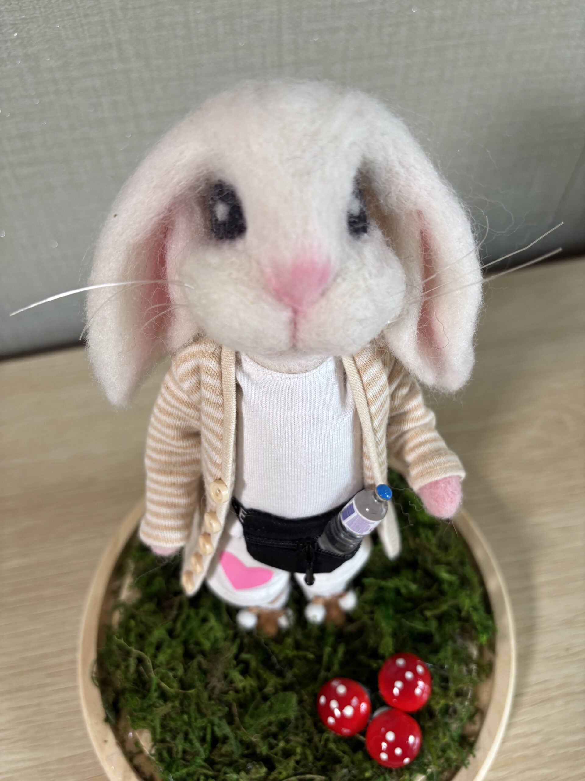 Avec son petit nez rose, son regard plein de douceur et son gilet rayé, elle respire la tendresse et la rêverie. À ses pieds, trois petites amanites rouges ponctuent la scène d’une touche de magie, comme si la forêt l’avait suivie jusque chez vous.