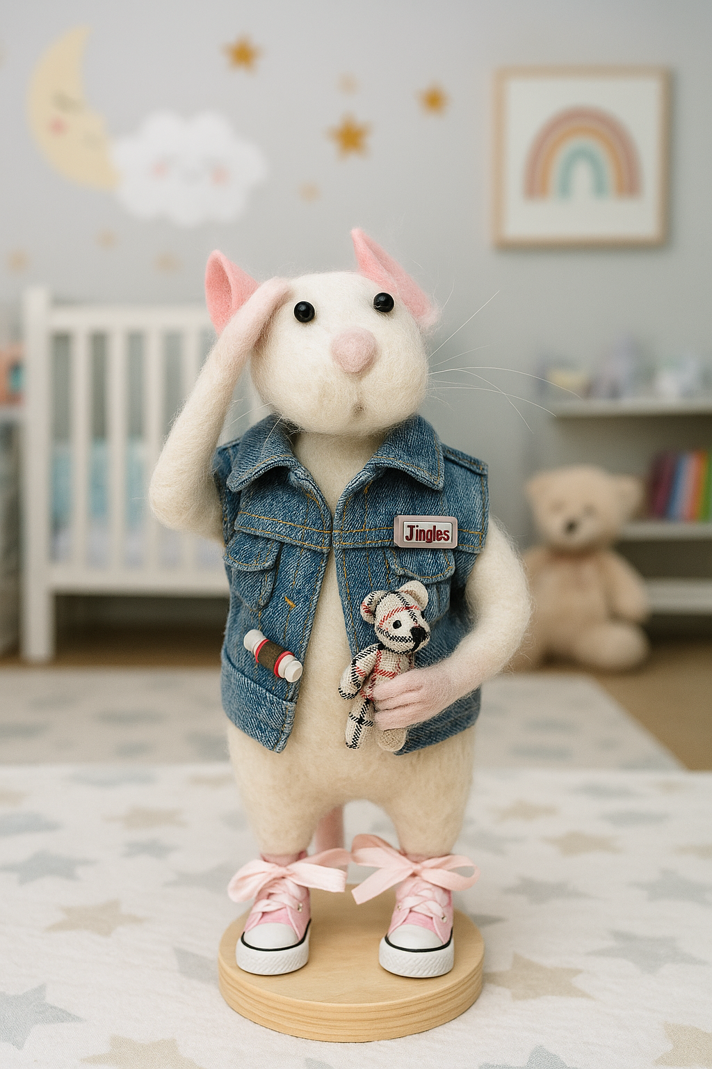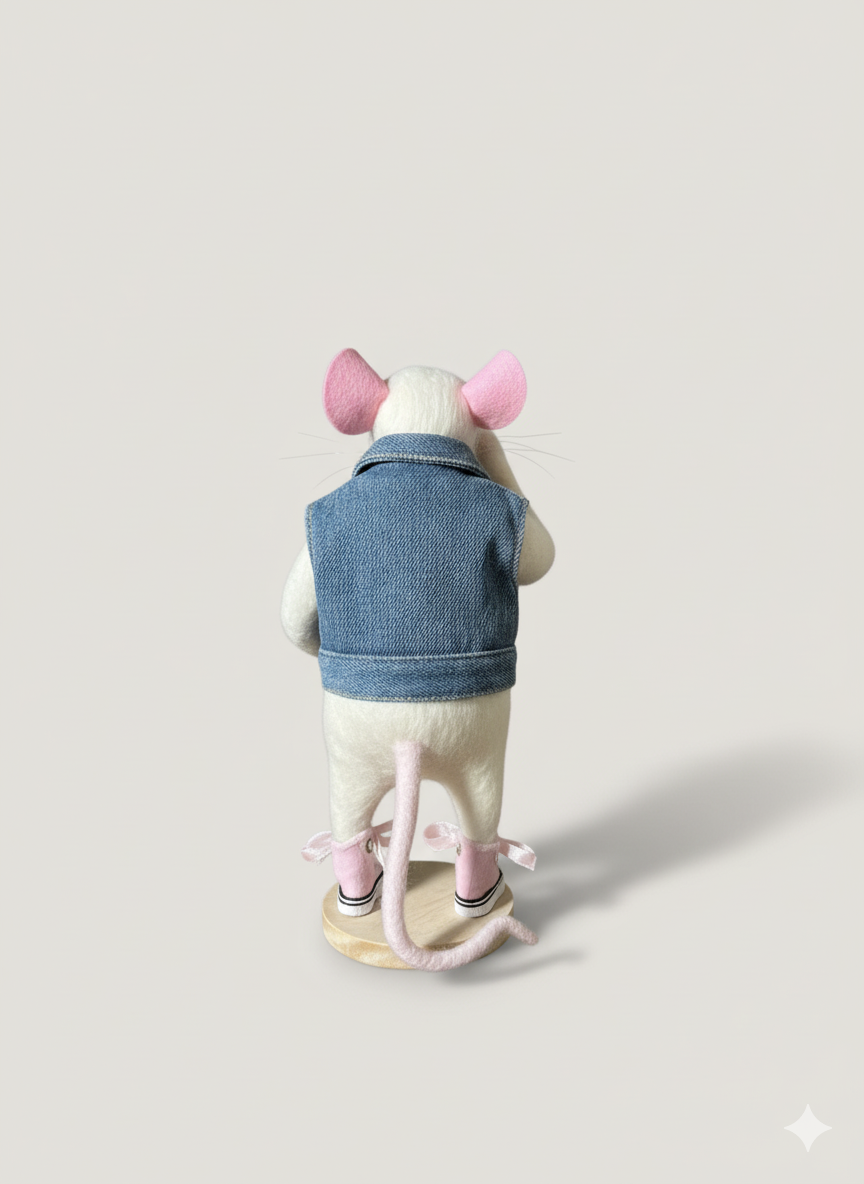 Toujours prêt à partir à l’aventure, Mister Jingles arbore son plus beau look : un gilet en jean customisé, ses baskets roses et un petit ours en tissu qu’il ne quitte jamais. Avec son air rêveur et son salut malicieux, il incarne la liberté, la tendresse et une bonne dose de rock’n’roll feutré ! 🎸✨
