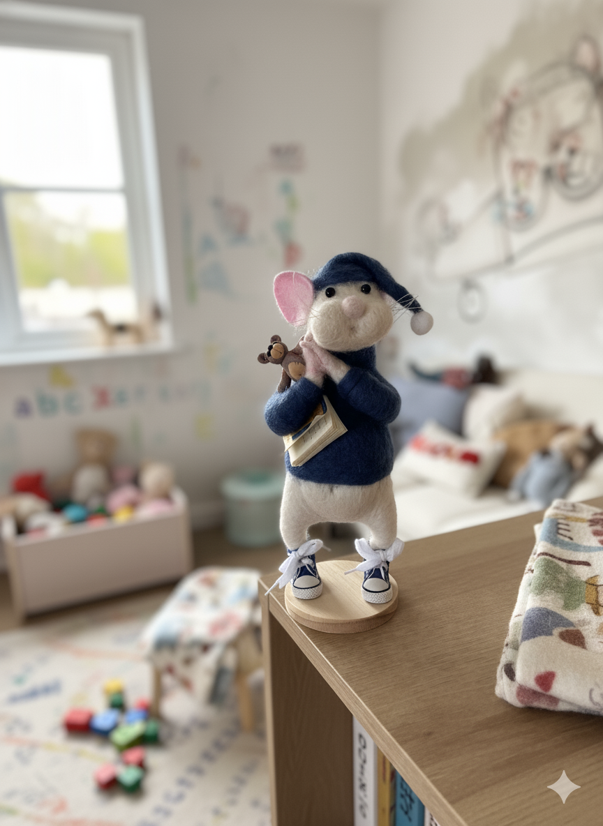 Sculpté à la main dans mon atelier à Wallers, Mister Jingles est réalisé en laine cardée selon la technique du feutrage à l’aiguille. Chaque détail — du badge à la mini canette dans la poche — est pensé avec minutie pour donner vie à ce petit personnage au grand cœur.